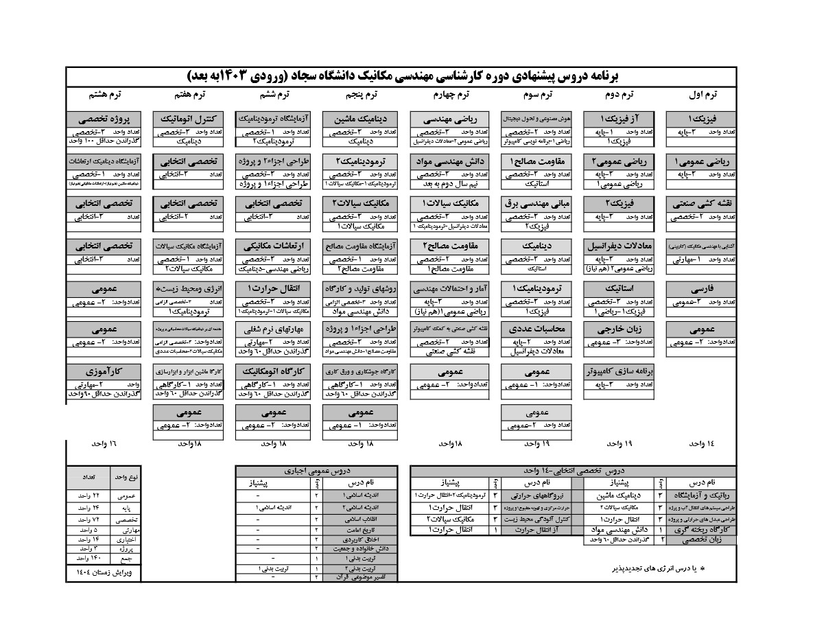 - چارت پیشنهادی دانشجویان مهندسی مکانیک ورودی ۱۴۰۳ و ۱۴۰۴ تغییراتی داشته است. فایل جدید چارت پیشنهادی و سرفصل جدید وزارت علوم در سایت دانشکده قسمت دروس کارشناسی بارگذاری شده است. جهت سهولت دسترسی در لینک زیر نیز قرار داده می شود.